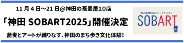 2025年11月4日(火).11月21日(金)の期間、神田エリアの蕎麦屋10店舗に個性豊かなアーティストの作品が展示され、蕎麦とアートが融合した新しいまち歩き体験をお届けします。昨年、23年ぶりの復活を果たした本イベントには多くの来場者が訪れ、「蕎麦屋めぐりをしながらアートを楽しむ」というユニークな文化体験が大きな話題となりました。今年もさらにパワーアップして開催します!